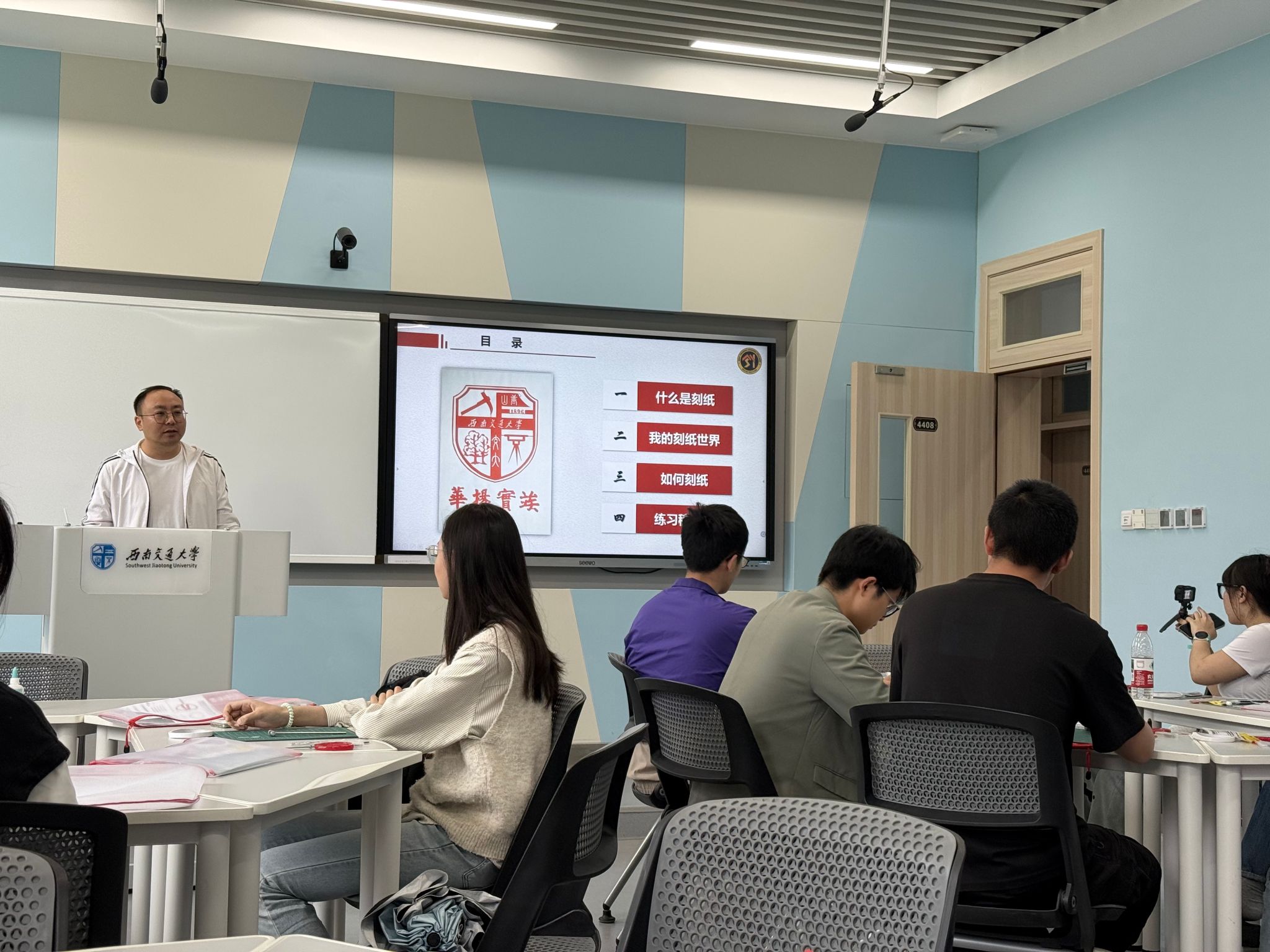 杨宏毅从刻纸的历史渊源、个人感悟,以及基础刀法、图案勾勒,到层次镂空、成品装裱,一步步带领同学们沉浸式感受传统刻纸艺术的独特魅力。实践环节,同学们以交大精神“竢实扬华”字样及校庆元素的纹样为模板,沉浸式投入创作。大家围坐桌前,细细描摹、耐心雕琢,在一刀一剪、一折一刻间感受非遗文化,在红白相映的纹样里体悟中华传统文化底蕴,以大家共同的心声为百卅交大献礼。