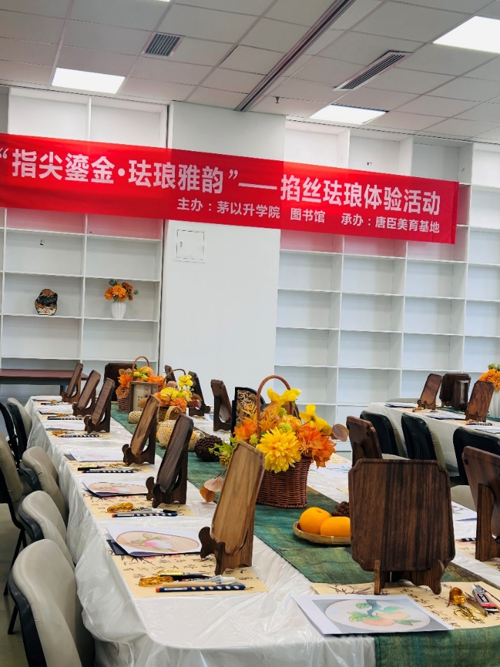 活动现场布置精致典雅,掐丝工具、铜丝原料、各色釉料整齐陈列,暖调装饰花艺点缀其间,浓厚的非遗文化气息扑面而来。活动伊始,专业讲师结合图文演示与实物展示,系统讲解掐丝珐琅的历史渊源、工艺特色及核心制作流程,带领同学们探寻这一传统技艺的千年韵味与独特匠心。