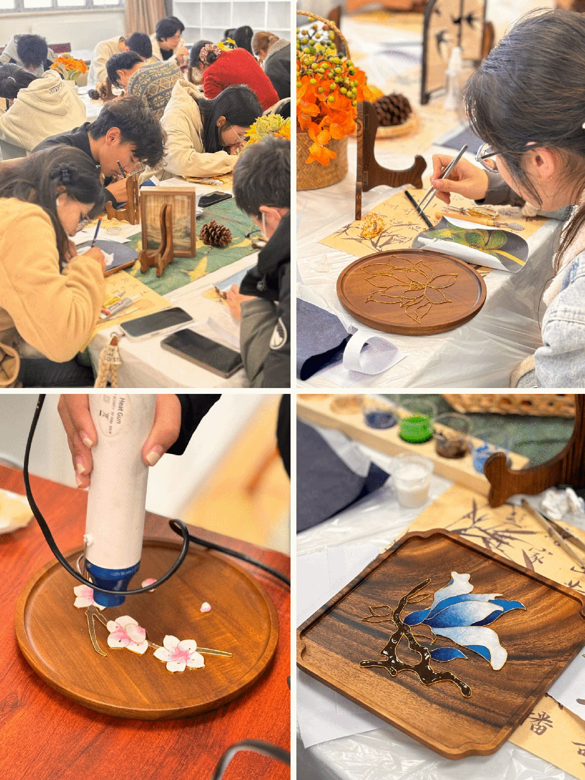实践环节中,同学们在讲师的悉心指导下,从纹样起稿、金丝掐制到釉料填充、细节修整,一步步完成专属掐丝珐琅作品。大家专注投入、匠心打磨,在指尖流转间体会非遗工艺的精细严谨,在动手实践中深化对传统技艺的认知与热爱,现场洋溢着专注而热烈的创作氛围。
