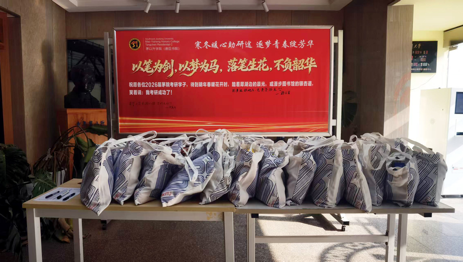 寒冬渐深,研考攻坚的号角已然吹响。为切实做好考研学子的服务保障工作,缓解备考压力、鼓舞冲刺士气,12月17日上午,茅以升学院“寒冬暖心助研途 逐梦青春绽芳华”2026届考研加油站慰问活动在天佑斋21栋唐臣书院一楼大厅温情启幕。茅以升学院党支部书记李毅、副书记杨宏毅和各位驻院导师莅临现场,带着由学院精心筹备的定制慰问礼包,为奋战在备考一线的学子们送去暖心关怀与诚挚祝福,为逐梦之路注入温暖力量。