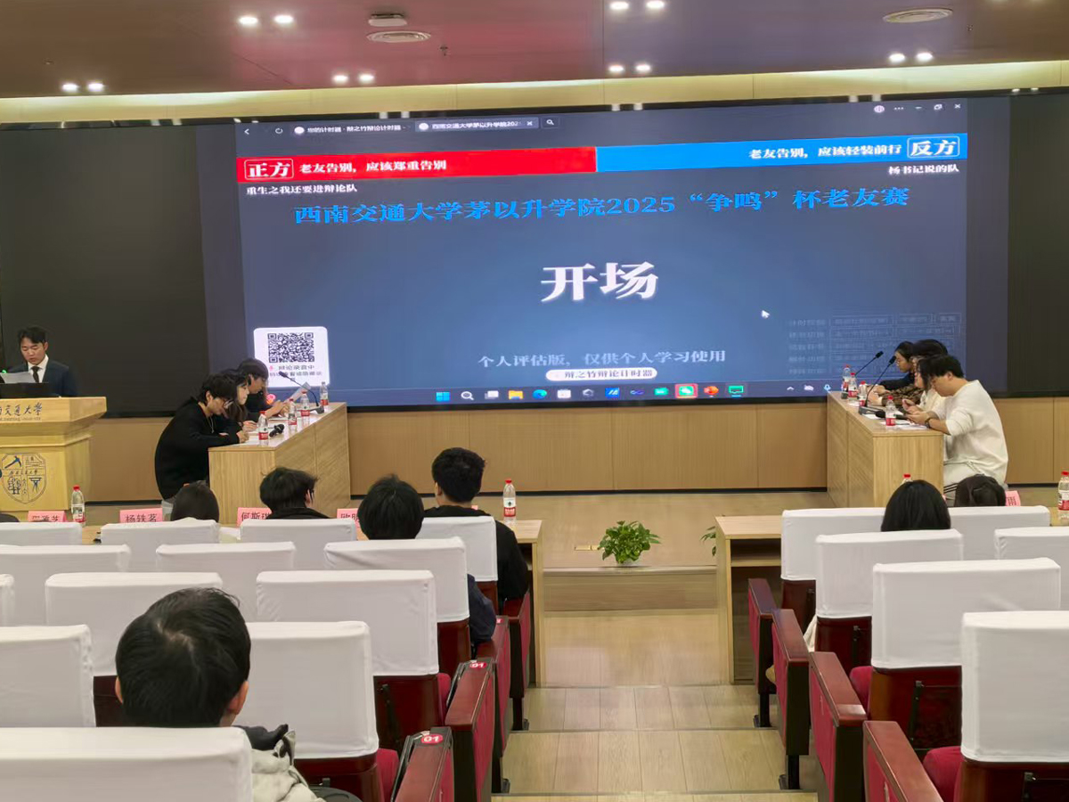 2025年12月18日晚,西南交通大学犀浦校区图书馆一号报告厅灯火璀璨,思辨之光点亮全场。由茅以升科创知行团精心策划主办的2025年茅以升学院“争鸣杯”辩论(老友赛)决赛,在师生与辩论爱好者的热切期盼中正式拉开帷幕。这既是一场语言交锋与逻辑思辨的巅峰对决,更是一场承载同窗情谊、凝聚深度思考的“老友”欢聚。经过数轮紧张激烈的精彩角逐,反方队伍凭借沉稳的整体发挥与灵活的临场应变摘得桂冠,队内二辩储弘锐同学以缜密的逻辑推演、动情的语言表达,斩获本场“最佳辩手”称号。